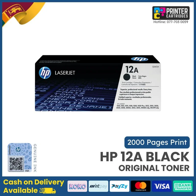 HP 12A Original LaserJet Toner Cartridge Black: HP LaserJet 1010 / 1012 / 1018, 1020 / 1022 series, 3015 / 3020 / 3030 Printers.